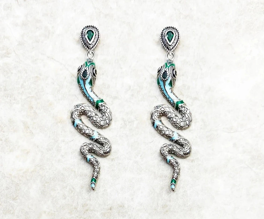 Indulge in the opulence of our Sterling Silver Medusa Snake Drop Earrings. Crafted with exquisite details, these earrings feature delicate green highlights that add a touch of luxury. Elevate any outfit with these elegant earrings that pay homage to the ancient symbol of wisdom and transformation.