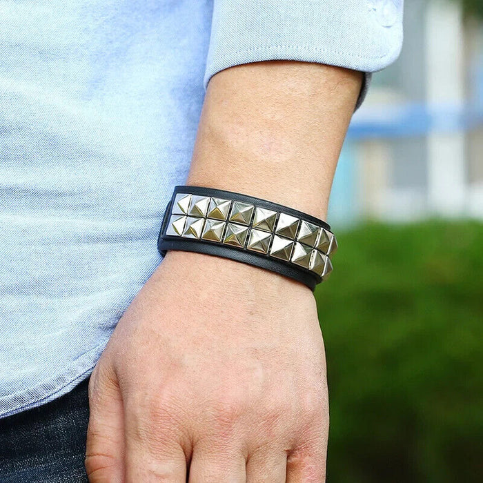 Two Row Pyramid Studded Leather Wristband